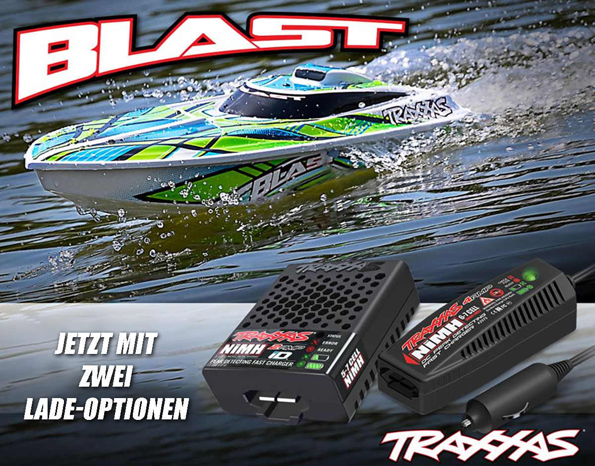 Das Blast Boot von Traxxas ist dank seiner Konstruktion schnell, zuverlässig und einfach zu steuern. Ab jetzt ist im Lieferumfang zusätzlich zum 4-Ampere-Ladegerät noch ein praktisches, neues 4-Ampere-USB-C-Ladegerät enthalten, um noch einfacher zu Hause oder unterwegs laden zu können.